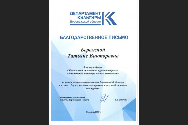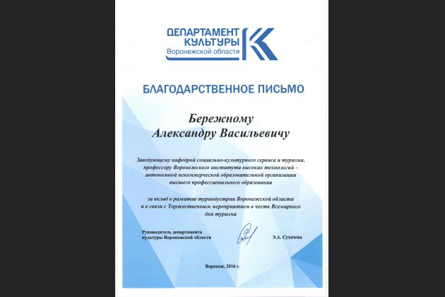 Заслуги учёных нашего института были отмечены благодарственными письмами Департамента культуры за разработку научных основ развития регионального туризма в Воронежском крае.