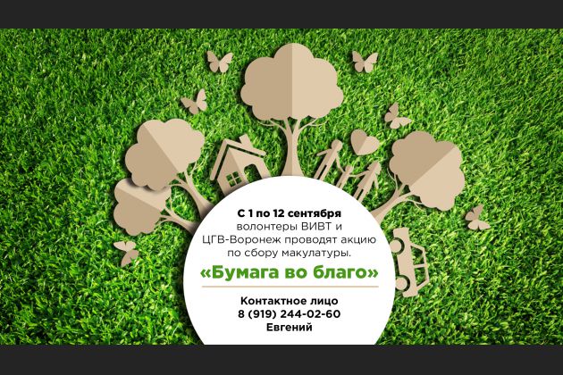 C 1 по 12 октября волонтёры ВИВТ и ЦГВ-Воронеж, совместно с отрядом студентов-волонтёров «Бегущие в ночи», предлагают всем принять участие в акции "Бумага на благо" по сбору макулатуры.