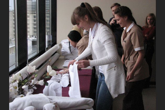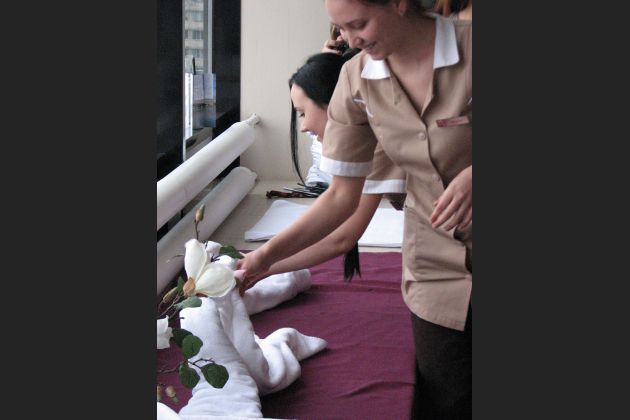 Руководитель службы приёма и размещения Максим рассказал о возможностях карьерного роста в отеле, а горничные Наталья и Татьяна дали мастер-класс по художественному оформлению ванных принадлежностей.