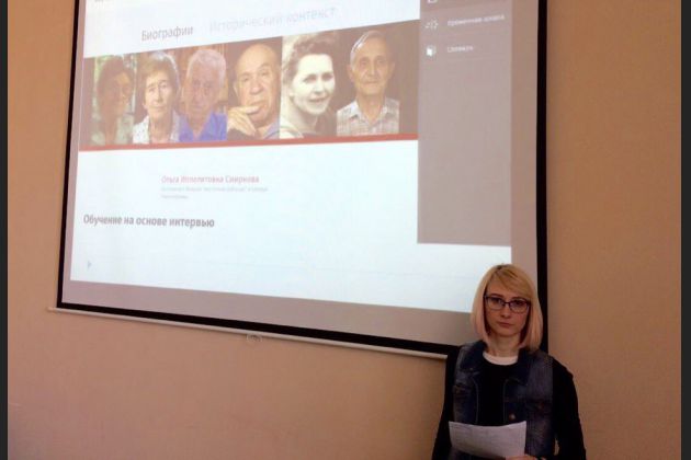 Второй год сотрудники Регионального центра устной истории Воронежского института высоких технологий принимают активное участие в работе конференции, организуемой РГАСПИ. В этот раз центр представляла А.-М. Карафизи с докладом «Онлайн - платформа «Обучение на основе интервью: принудительный труд 1939- 1945 гг» как опыт российско-германского проектного сотрудничества». Доклад вызвал живой отклик аудитории, а также предложения о сотрудничестве.