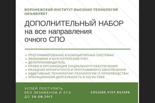 Дополнительный набор на программы очного СПО до 29.08.2017