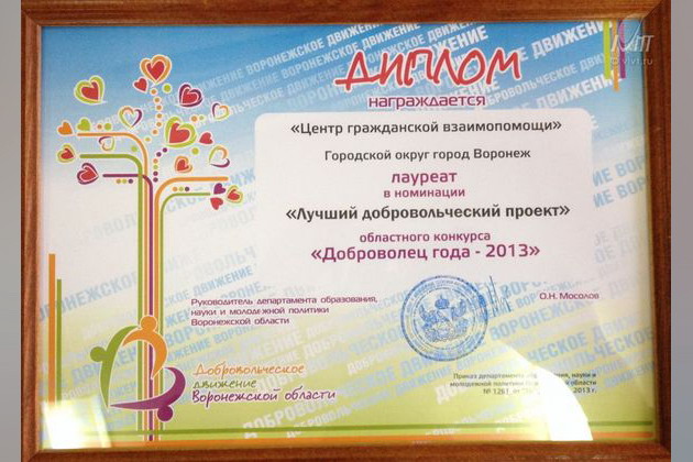 ГБУ ВО «Областной молодежный центр» совместно с департаментом образования, науки и молодежной политики Воронежской области впервые провели областной конкурс «Доброволец года». Конкурс проводился по четырём номинациям: «Личный вклад», «Лучшее добровольческое объединение», «Лучший добровольческий проект» и «Поступок года». В оргкомитет конкурса было подано 65 заявок, из них после оценки экспертами было отобрано несколько лучших, авторы которых и стали лауреатами. И нам приятно отметить, что лауреатом в номинации «Лучший добровольческий проект» стал Центр гражданской взаимопомощи – Воронеж.