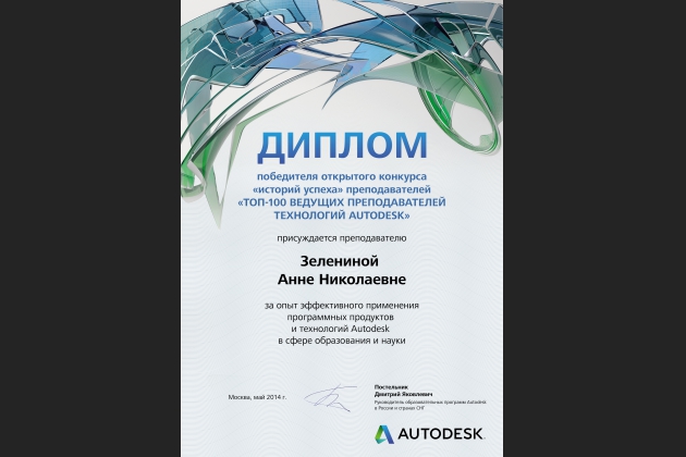 Доцент Воронежского института высоких технологий, ведущий специалист учебно-методического отдела, Зеленина Анна Николаевна вошла в «ТОП-100 ведущих преподавателей̆ технологий Autodesk», став победителем открытого конкурса «Историй успеха» преподавателей, проводимого компанией «Autodesk».
