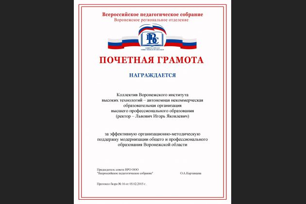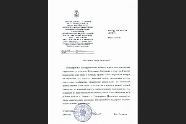 Благодарственные письма и грамоты на имя ректора и коллектива ВИВТ