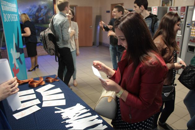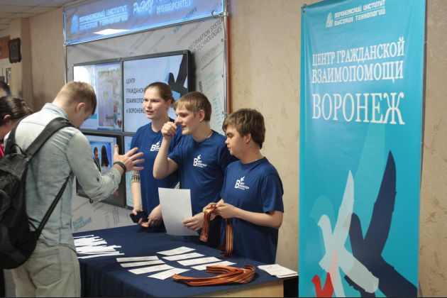 27 апреля в Воронежском институте высоких технологий стартовала акция “Георгиевская ленточка”. Студенты провели викторину, в которой предложили студентам и администрации ВИВТ ответить на вопросы, касающиеся Великой Отечественной Войны, исполнить песню или прочитать стихотворение о военном времени. Атрибут акции представляет собой символическую ленту, в которой использован традиционный биколор «Георгиевской ленты». Он хорошо известен каждому и использовался при создании одной из главных наград ВОВ — «Ордена Славы». «Георгиевская ленточка» не является ее точной копией, но призвана ассоциироваться с этим символом доблести и мужества.