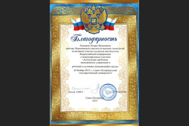 Воронежский институт высоких технологий представляла студентка Ирина Гусарова с докладом «О возможностях развития туристической индустрии в регионе».По итогам конференции Ирина была награждена дипломом.